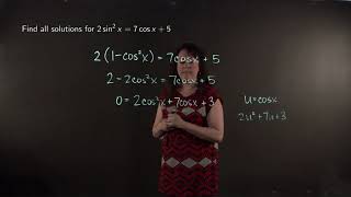 Solution Method: This equation has both sine and cosine terms and differing powers, which makes it complicated to solve. It is easier to solve an equation of one trig value. This is where trig identities come in. Specifically, the Pythagorean identity \(\sin^2{x}+\cos^2{x}=1\), relates sine and cosine. I have a \(\sin^2{x}\) in my equation, so I can solve the identity for \(\sin^2{x}\) in terms of \(\cos{x}\), and substitute in to the equation. \[\begin{aligned} \sin^2{x}+\cos^2{x}=1 \\ \sin^2{x}=1-\cos^2{x} \end{aligned}\] \[\begin{aligned} 2\sin^2{x}&=1+\cos{x} \\ 2(1-\cos^2{x})&=1+\cos{x} \\ 2-2\cos^2{x} &= 1+\cos{x} \end{aligned}\] Now I have a quadratic of cosine, so I’ll move all terms onto one side so my quadratic is equal to zero. \[\begin{aligned} -2\cos^2{x}-\cos{x}+1 &=0 \\ 2\cos^2{x}+\cos{x}-1 &=0 \end{aligned}\] Now I’ll try to factor the quadratic of cosine like I would the equation \(2x^2+x-1=0\). So I need two numbers that multiply to be -2 and sum to 1. So they must be 2 and -1.Since the leading coefficient of the quadratic is not one, we will split \(\cos{x}\) into \(2\cos{x}\) and \(-\cos{x}\) and factor by grouping. \[\begin{aligned} 2\cos^2{x}+\cos{x}-1 &=0 \\ 2\cos^2{x}+2\cos{x}-\cos{x}-1 &= 0 \\ 2\cos{x}(\cos{x}+1)-(\cos{x}+1) &= 0 \\ (2\cos{x}-1)(\cos{x}+1) &= 0 \end{aligned}\] So now I can set each factor to 0 separately and solve for x. \[\begin{aligned} 2\cos{x}-1&=0 \\ 2\cos{x}&=1 \\ \cos{x} &= \frac{1}{2} \end{aligned}\] The reference angle that produces cosine equal to \(\frac{1}{2}\) is \(\frac{\pi}{3}\). The one-half is positive. Cosine is positive in (ASTC) Q1 and Q4. So the values satisfying \(\cos{x}=\frac{1}{2}\) on \([0,2\pi]\) are \(\frac{\pi}{3}\) in Q1 and \(\frac{5\pi}{3}\) in Q4. But I was asked to find all the values of x satisfying the equation. Since trig functions are periodic, they repeat themselves every rotation, every \(2\pi\). So every full rotation, \(2\pi\), from \(\frac{\pi}{3}\) and \(\frac{5\pi}{3}\) is another value satisfying the equation. So we can represent all the values satisfying the equation as \(x=\frac{\pi}{3} + 2\pi n, n\in \mathbb{Z}\) and \(x=\frac{5\pi}{3} + 2\pi n, n\in \mathbb{Z}\). The \(2\pi\) represents a full rotation back to where we started and \(n\) is an integer (...-2,-1,0,1,2...) which represents how many rotations we’ve made (forwards or backwards).